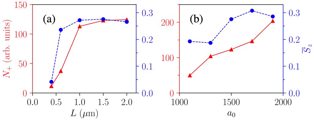 图2.正电子产额和极化率随(a)预等离子体密度标长和(b)激光场强的变化。