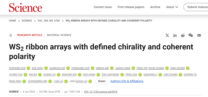 深圳先进技术研究院丁峰研究员等团队合作,提出“多重界面耦合原子制造”新策略,首次实现兼具特定手性结构(包括扶手椅型、之字型及其他手性结构)及相干极化方向的二硫化钨(WS2)条带阵列的“全同”控制制造。通过系统研究手性结构与体光伏效应的对应关系,实现1000余根扶手椅型条带阵列的自发光电流集成输出。该研究为一维结构的原子级精准制造提供了定制化方案,有望促进其在新型电学、光电转换器件的阵列化集成芯片加工。2024年6月6日,相关成果以“具有可控手性与相干极性的二硫化钨条带阵列”(WS2 ribbon arrays with defined chirality and coherent polarity)为题,在线发表于《科学》(Science)。