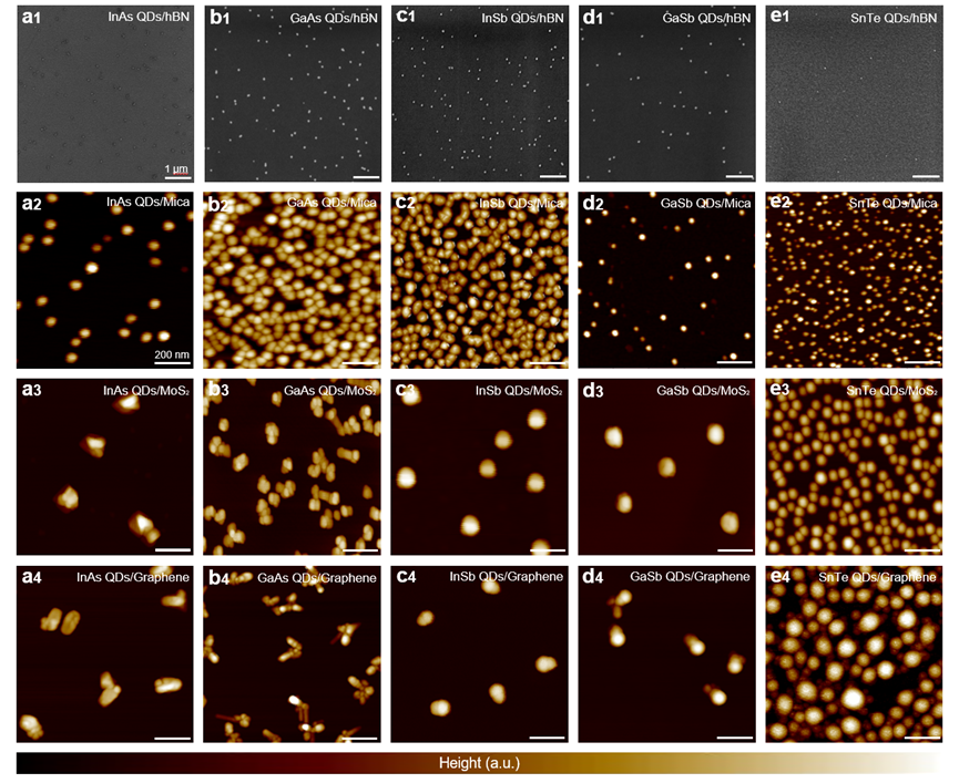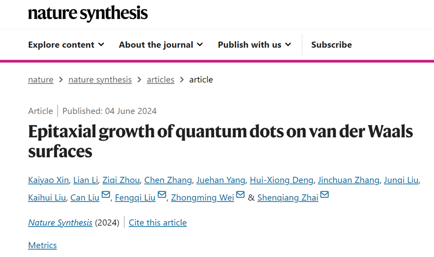 半导体研究所翟慎强研究员、魏钟鸣研究员、刘峰奇研究员,北京大学刘开辉教授等团队合作,提出二维界面范德华外延半导体量子点(QD)新策略,突破了传统量子点晶格匹配外延限制,实现了多类III–V族、IV–VI族本征量子点的通用制备。2024年6月4日,相关成果以“Epitaxial growth of quantum dots on van der Waals surfaces”为题,在线发表于《自然·合成》(Nature Synthesis)。