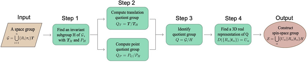 刘正鑫教授的指导下,对自旋空间群进行了完整的列举,用于完整描述磁结构的对称性。图1展示了列举的思路。对于12倍以内扩胞的磁结构,得到157289个非共面自旋群,24788个共面非共线自旋群,以及1421个共线自旋群。所有自旋群的信息可在线上数据库中查询。自旋空间群的完整列举不仅可以更全面地描述磁结构,还可以用来描述电子能带结构的对称性。自旋轨道耦合效应较弱的材料(如Mn3Sn)的某些高维简并对应于自旋空间群的不可约表示,无法用磁空间群的表示理论解释。因此,自旋空间群在理解磁性材料的电子能带和拓扑结构方面具有很大优势。该工作以“Enumeration of Spin-Space Groups: Toward a Complete Description of Symmetries of Magnetic Orders”为题发表于Physical Review X14, 031039(2024)(预印版arXiv: 2307.10371)。该杂志同一期还发表了北京大学宋志达教授课题组和南方科技大学刘奇航教授课题组独立完成的对自旋空间群的列举工作PRX14, 031037,PRX14, 031038,这三篇工作开启了磁性材料“自旋群磁性”研究的新方向。
