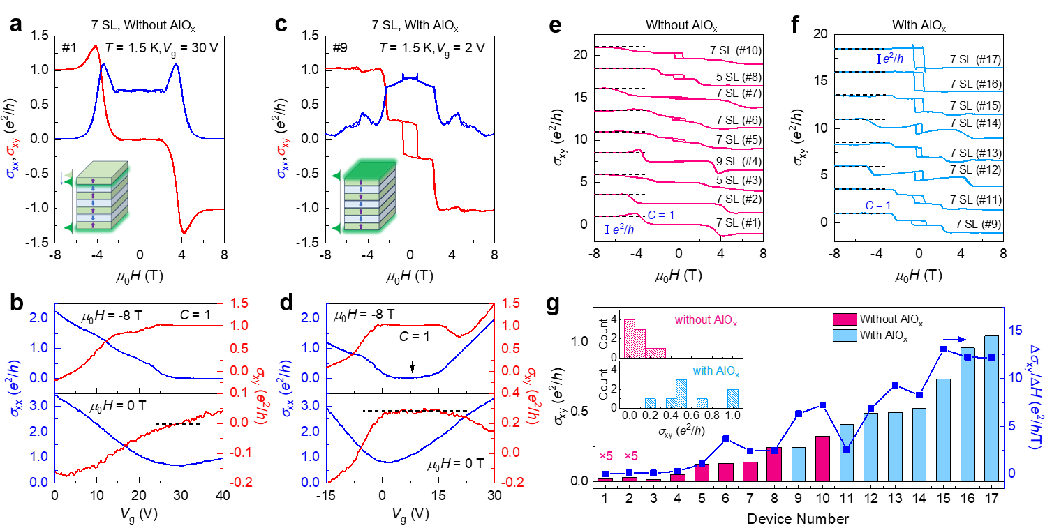 随后,团队研究了氧化铝对奇数层MnBi2Te4量子输运行为的影响。如图2a至2d所示,磁输运测量清楚的表明对于没有氧化铝保护的样品,其霍尔电导σxy在零场附近展现出一个只有偶数层样品中才会出现的零级平台,这意味着原本层厚为7层的样品在经历微加工之后有效层厚已经减小为6层。与之形成鲜明对比的是,表面沉积了氧化铝的样品在零磁场下表现出显著的霍尔效应回滞,这意味着长程反铁磁序在微加工之后一直稳定存在。为了进一步消除器件质量涨落对输运结果的影响,团队对17块奇数层器件低温下的输运行为开展研究,并对其反常霍尔效应行为开展统计分析。如图2e至2g所示,相比较于传统方法制备的器件,所有沉积了氧化铝的器件在反常霍尔效应数值方面均有了显著的提升,有2块器件在零场下进入量子化状态,其σxy达到一倍量子电导e2/h,这意味着团队首次在多个反铁磁器件中实现了量子反常霍尔效应。