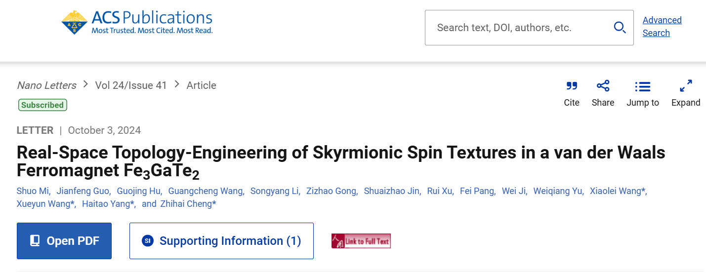 Mi, S.;Guo, J.;Hu,G.;Wang,G.;Li,S.;Gong,Z.;Jin,S.;Xu,R.;Ji,W.;Yu, W.; Wang, X.; Wang, X.; Yang, H.; Cheng, Z.Real-Space Topology-Engineering of Skyrmionic Spin Textures in a van der Waals Ferromagnet Fe3GaTe2.Nano Lett.2024, DOI:10.1021/acs.nanolett.4c04031
