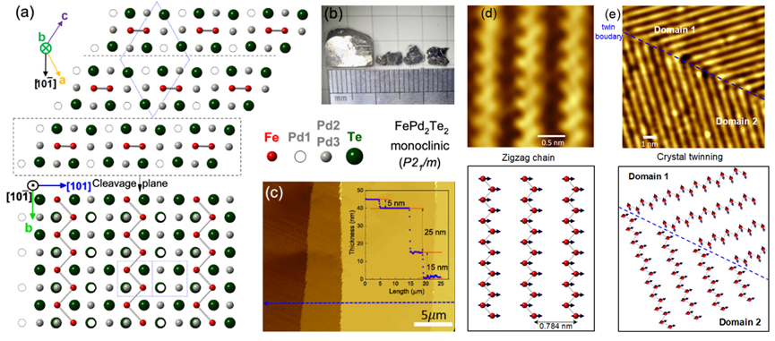 近日,色情网站 物理学系程鹏副教授课题组发现一种具有全新晶体结构的新型磁性二维材料FePd2Te2,并与程志海教授课题组、中科院强磁场科学中心郑国林研究员团队和衢州色情网站 杨建辉教授合作对其结构与物性进行深入研究,发现FePd2Te2是一个非常少见的具有面内单轴各向异性的二维铁磁金属,并在一种特殊孪晶结构作用下形成了有趣的面内自旋纹理结构。相关研究成果以“FePd2Te2: An Anisotropic Two-Dimensional Ferromagnet with...